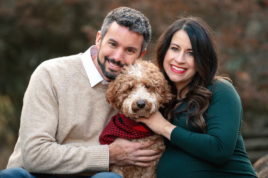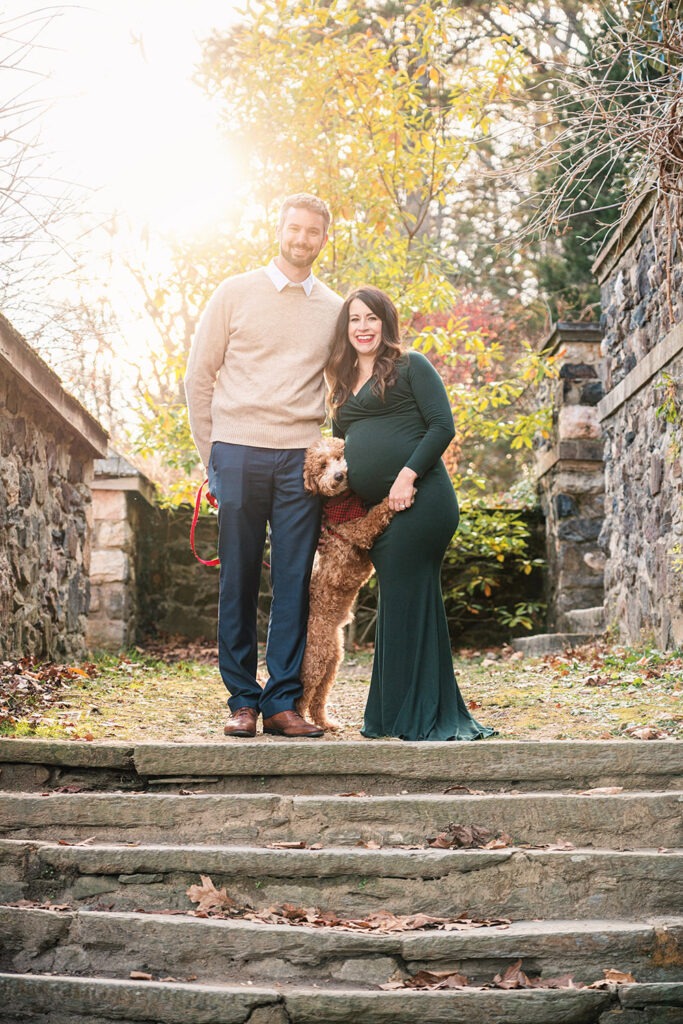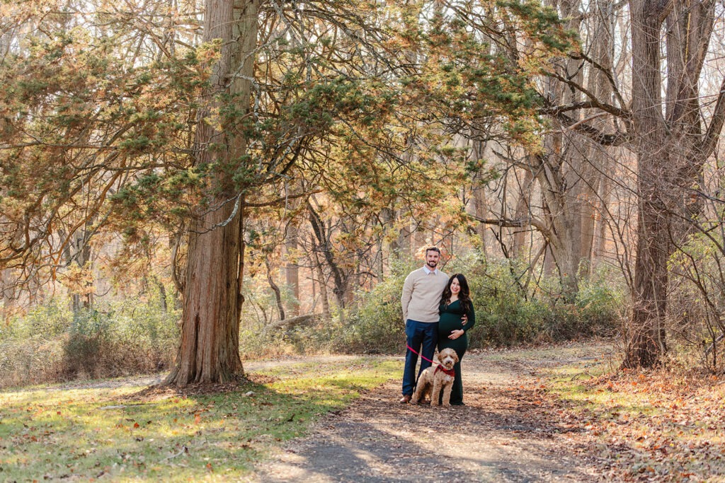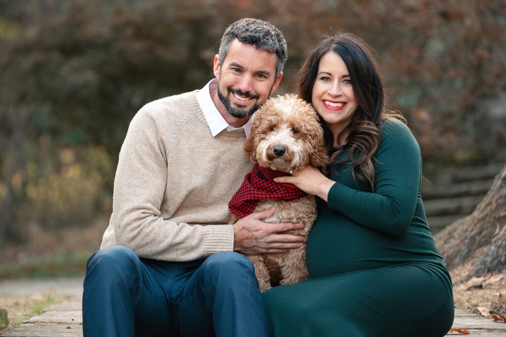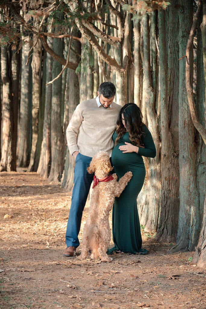 An amazing maternity photo shoot with a beautiful expecting mother, father and their furry companion! Including pets in these types of sessions adds an extra layer of love and connection. I always recommend coordinating outfits to complement the dog’s coloring, it makes for beautiful and cohesive shots.