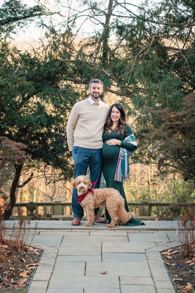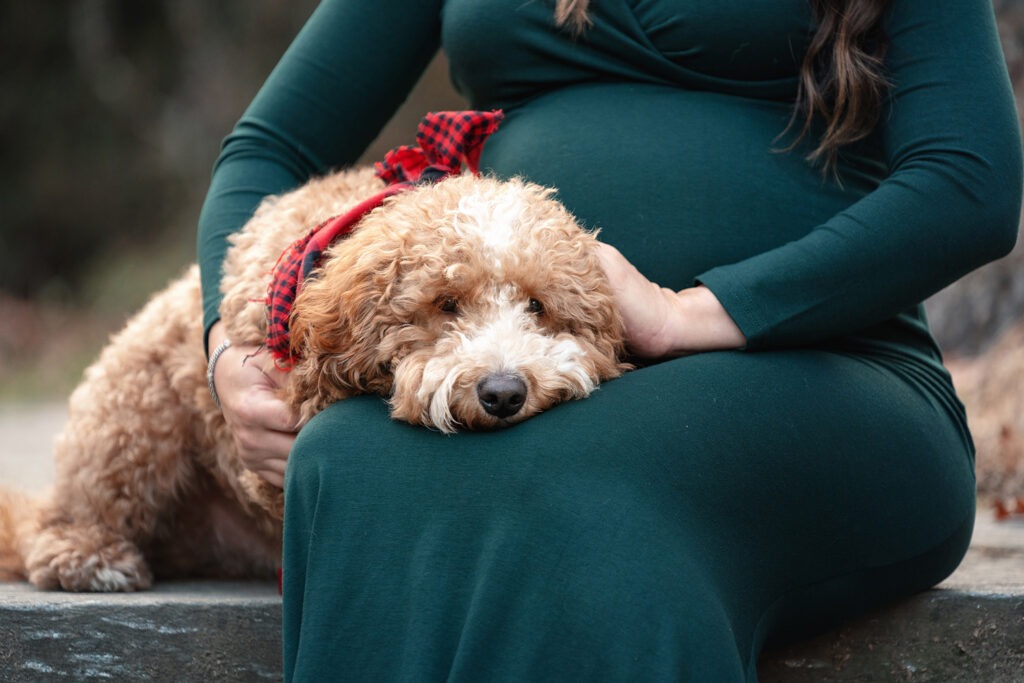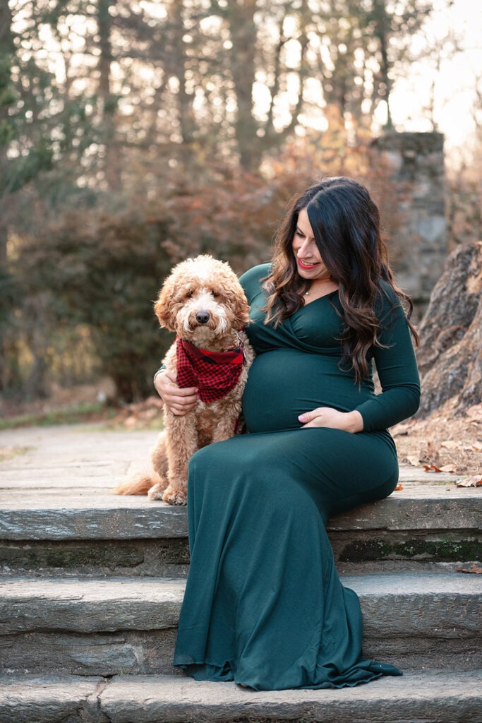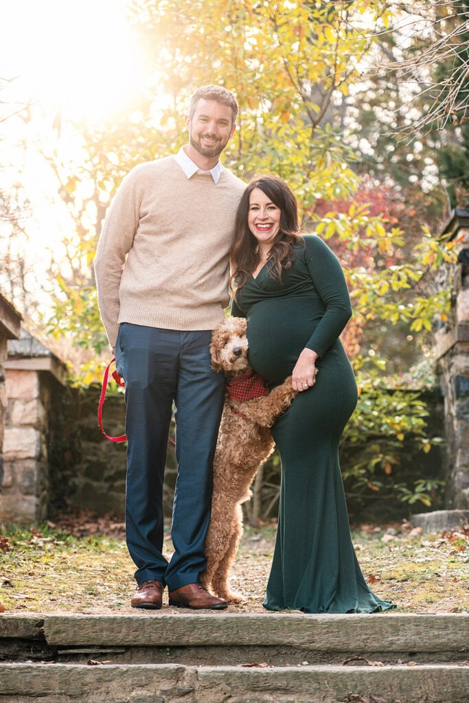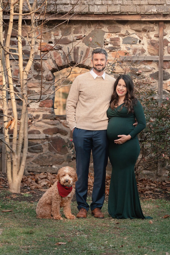 An amazing maternity photo shoot with a beautiful expecting mother, father and their furry companion! Including pets in these types of sessions adds an extra layer of love and connection. I always recommend coordinating outfits to complement the dog’s coloring, it makes for beautiful and cohesive shots.